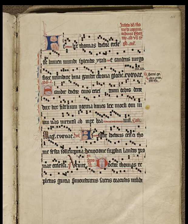 « Felix Thomas doctor ecclesie lumen mundi splendor Ytalie candens virgo flore mundicie bina gaudet corona glorie. » Heureux Thomas, docteur de l‘Eglise, lumière du monde, splendeur de l’Italie, vierge et fleur resplendissante de pureté, la double couronne de gloire fait ta joie.