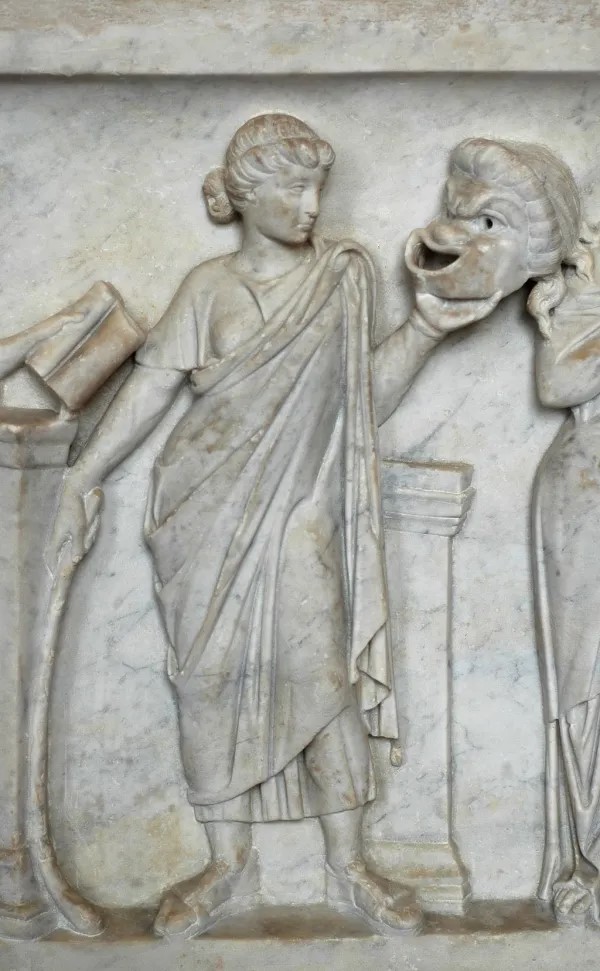 Melpomène : Muse de la tragédie : cor, masque tragique Polymnie : Muse des chants nuptiaux et de deuil et de la pantomime : couronne, orgue