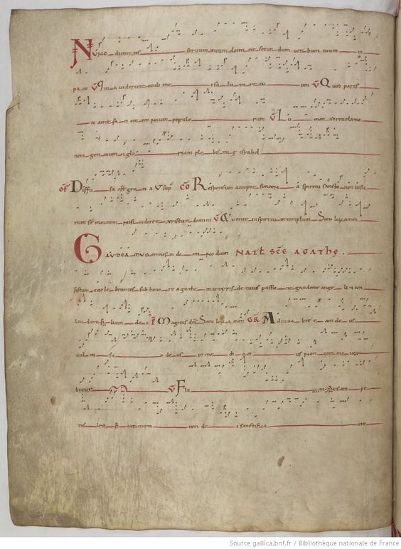 Un exemple de la fin du XIième siècle, le Graduale et prosarium sancti Martialis Lemovicensis, provenant de l'abbaye Saint-Martial de Limoges. On y voit la naissance des vocalises et des tropes (adjonction de paroles sous une longue vocalise d'une mélodie donnée, ou l'inverse, le texte sur la mélodie).