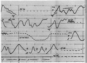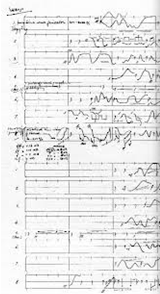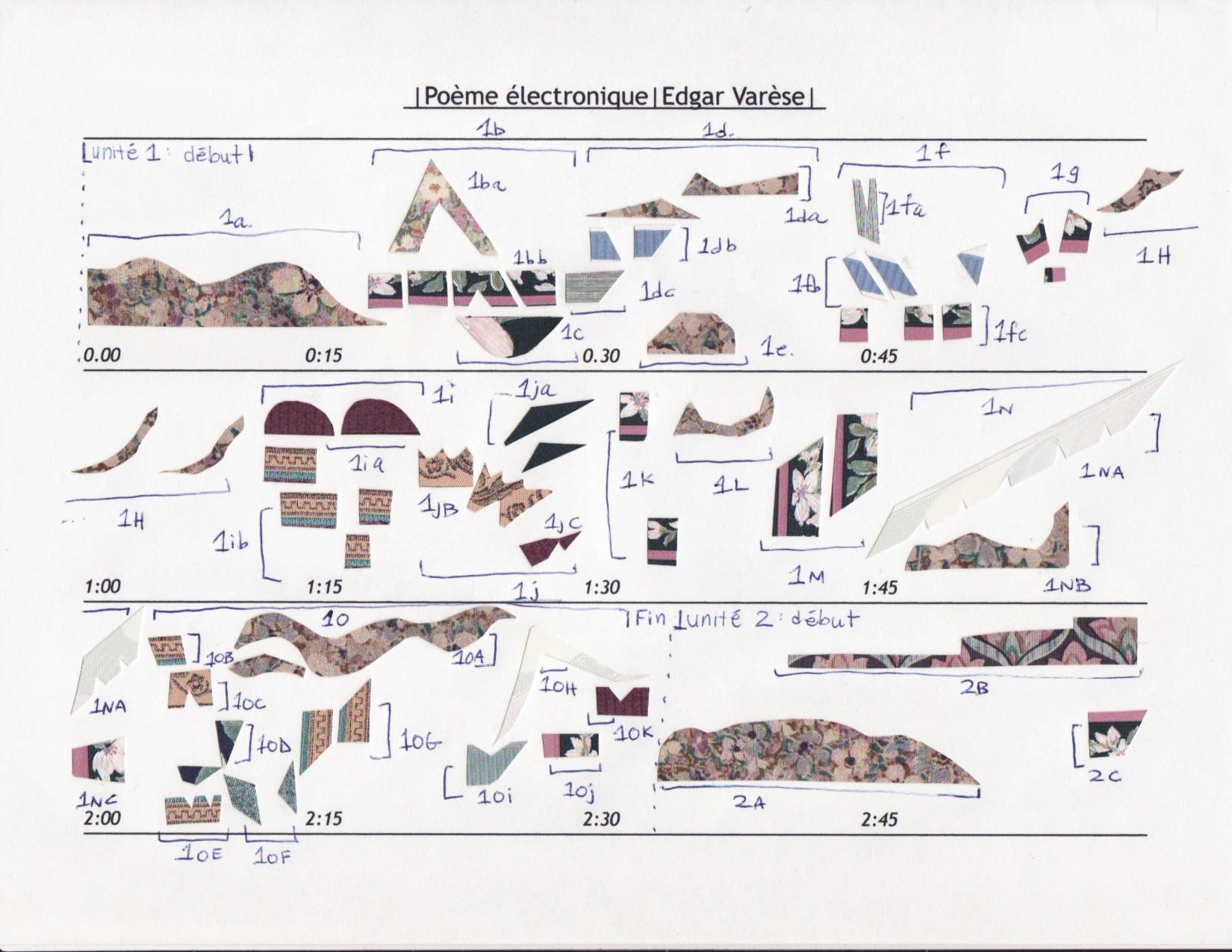 Comme en témoigne la photographie du feuillet, l’écriture du Poème Électronique n’a pas nécessité l’utilisation de partitions, mais de diagrammes qui permettent de suivre le déroulement de la musique seconde par seconde.