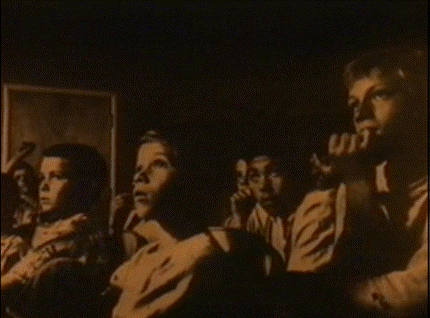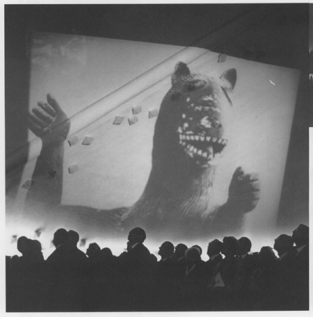 - De l’obscurité à l’aube : les yeux de divers animaux et de personnes, une tête de hibou, une tête de dinde, un visage de femme, des sculptures tribales, des chefs, des tombes, des camps de concentration, des soldats de plomb, des chars, des cow-boys et des Indiens, des fusils, des sculptures religieuses médiévales, un Bouddha.