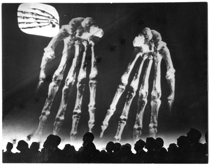 - Deux personnages suspendus dans l'espace - une figure féminine et une sculpture abstraite en tubes métalliques - qui brillent en rouge et bleu verdâtre lorsqu'il est irradié par la lumière ultraviolette;