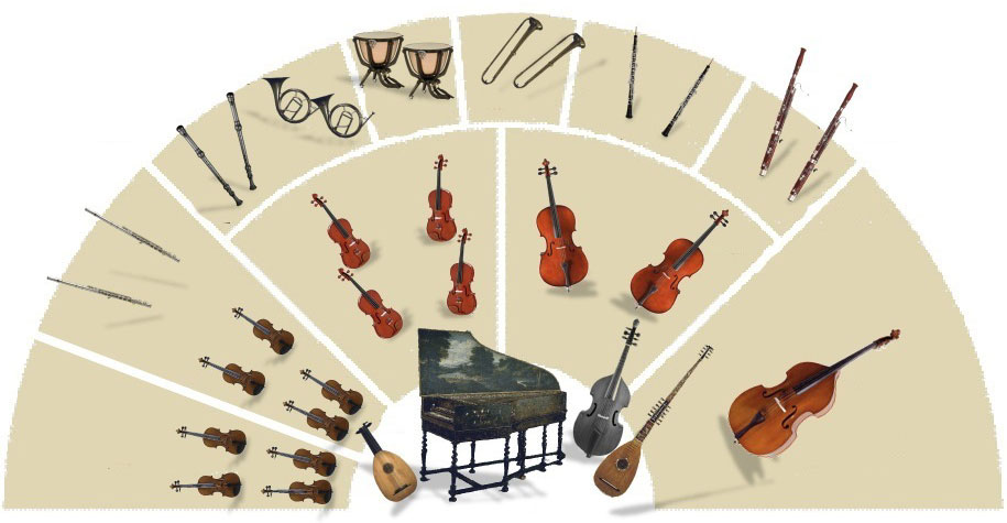 On y recense 10 violons à archet courbe ( 5 premiers et 5 seconds), 2 violes de gambe, 4 violes de braccia ( ancêtres de l'alto), 1 hautbois et 1flûte à bec ( en bois ) et 1 clavecin. Les violes d'amour ( à 12 cordes, six sur lesquelles on joue, six autres faisant écho ) apparaissent dans certaines formations. Mais on en trouve encore d'autres (voir le schéma).