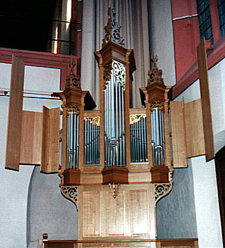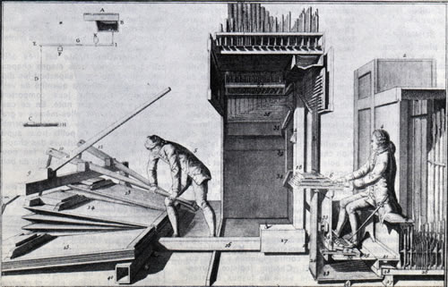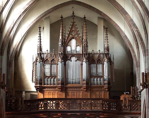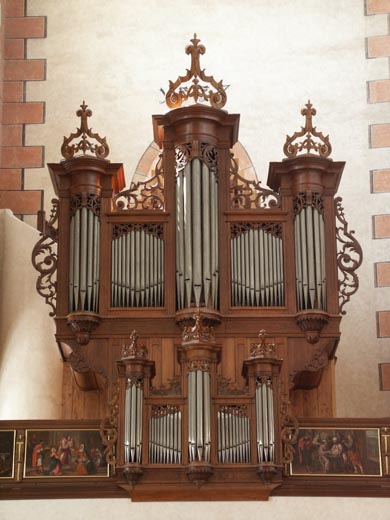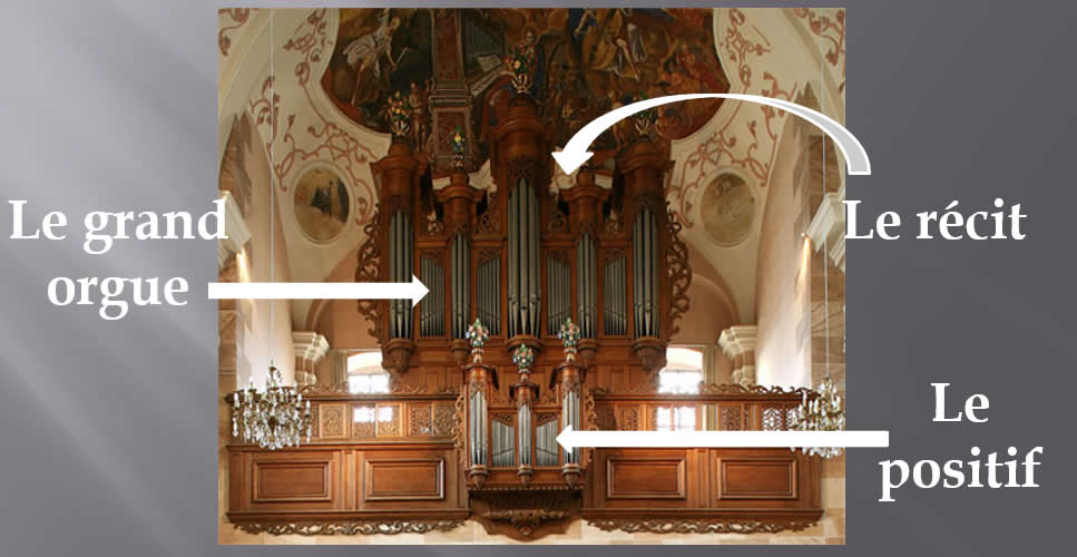 L'orgue est en réalité constitué de plusieurs petits orgues, comme le montre l'image suivante. Dans cet instrument d'Ebersmunster vous avez trois orgues : le positif, un orgue moyen posé au sol et commandé par un clavier, le grand orgue, un orgue majestueux un peu en hauteur, commandé par un autre clavier, et derrière, caché dans une boîte, le récit, un petit orgue invisible commandé par un troisième clavier. Il y a donc trois orgues, en réalité. Et ces trois orgues sont belles, brillantes ou douces à entendre.