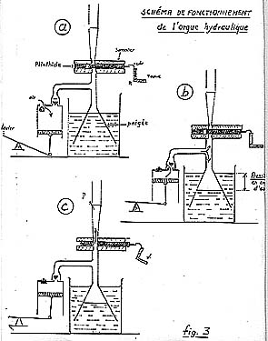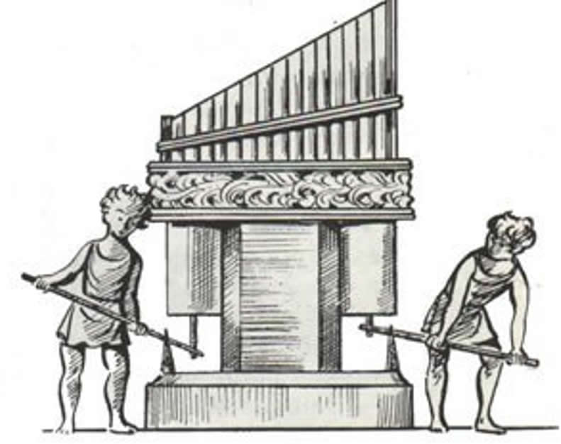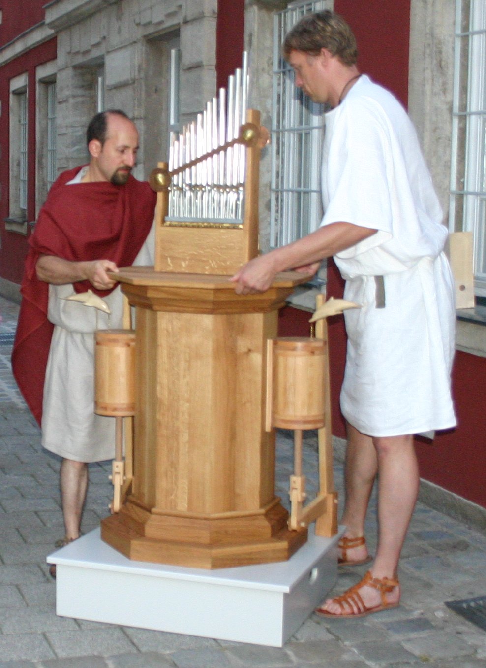 Les premiers orgues s’appelaient «organa hydraulica» ou «hydraulos». Ils utilisaient l’eau pour régulariser la pression de l’air et mettaient en oeuvre les lois de l’hydrostatique, sans doute parce que Ctésibios était contemporain du savant grec Archimède ! Mais à cette époque, l’intérêt suscité alors par l’hydraulos était plus technique que musical. Plus tard, les romains développèrent à leur tour un instrument analogue à celui de Ctésibios : une soufflerie hydraulique, un clavier à tirettes et quelques tuyaux à anche ou à embouchure de flûte. De nombreux restes archéologiques (monnaies, lampes à huile, mosaïques… et même les restes d’un petit instrument retrouvés à Acquinum (aujourd’hui Budapest)…) permettent de se faire une excellente idée de ce qu’était alors l’instrument et de le reconstituer assez fidèlement, au moins en ce qui concerne la partie mécanique.