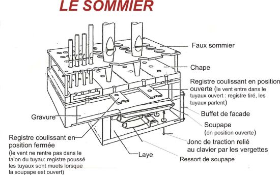 Mais le coeur de l'orgue, cest le sommier. Tout le mécanisme est contenu dans cette boîte, entre la touche du clavier et le tuyau